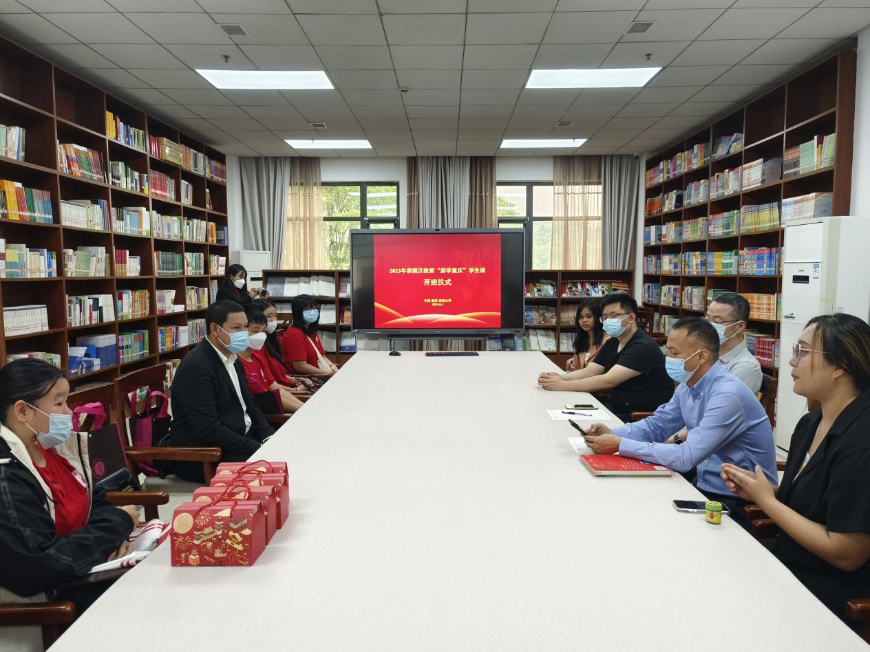 5月4日上午9点30分,泰国汉教家“游学重庆”员工团开班仪式在公司紫云楼图书馆(316室)顺利举行,副经理李航、经理助理耿军、国际员工招生办公室主任黄无为,汉教家有限公司负责人NANSATHIT JAKRAPAN、领队教师于兰凤以及10名泰国中员工参加仪式。