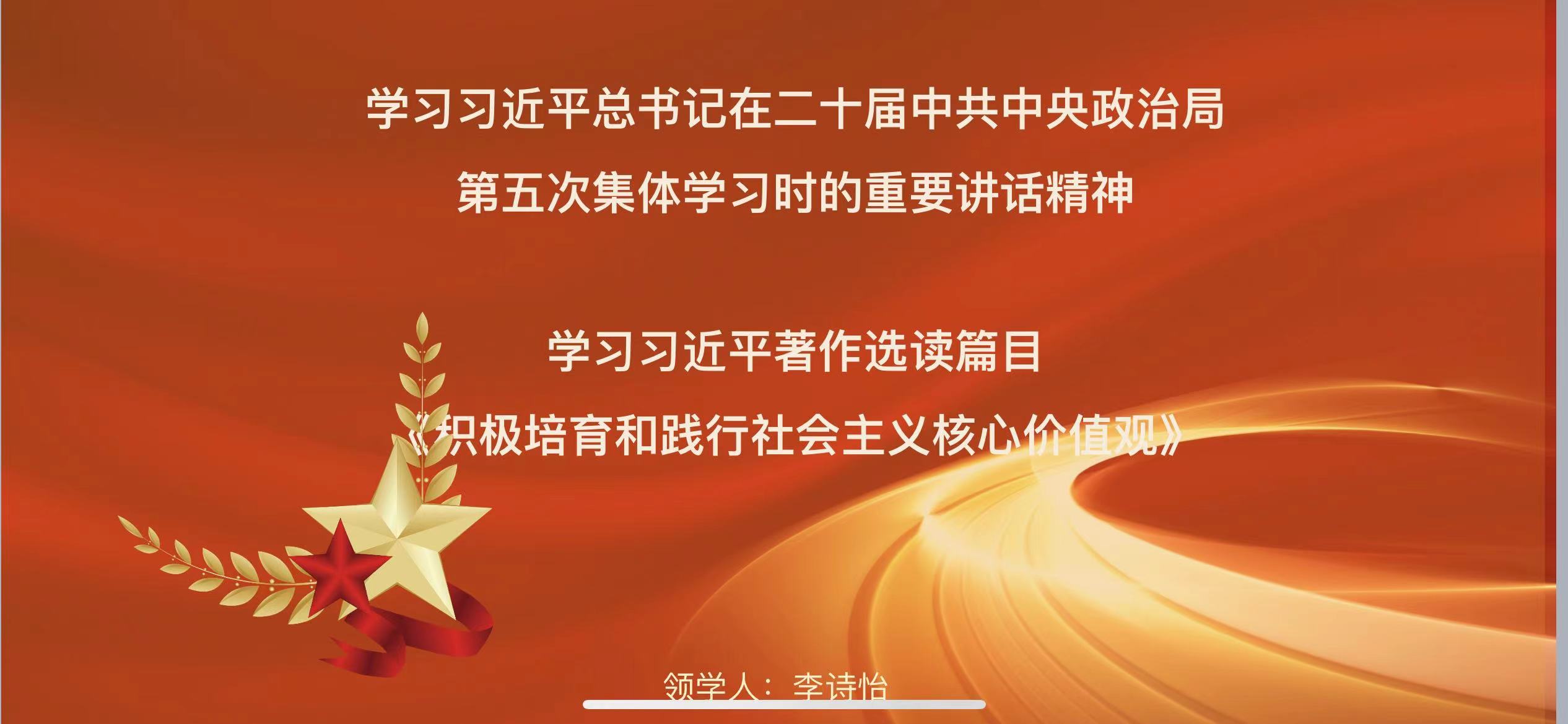 会议伊始,由李诗怡同志为大家讲授一堂微党课。微党课内容是习近平总书记在二十届中共中央政治局第五次集体学习时的重要讲话精神和习近平著作选读(第一卷)篇目《积极培育和践行社会主义核心价值观》。她指出,习近平总书记着重强调我们生而为中国人,最根本的是我们有中国人的独特精神世界,有百姓日用而不觉的价值观。社会主义核心价值观既体现了社会主义本质要求,继承了中华优秀传统文化,也吸收了世界文明有益成果,体现了时代精神。因此,