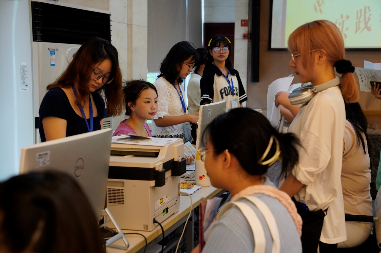 新同学将随身大件行李安置宿舍之后便再次乘坐等待着他们的校园观光车来到了suncitygroup太阳集团报告厅——2023国际员工新生注册报到一站式服务区:发放缴费通知单、收费、指导员工购买保险、居留许可证办理等,让报到流程更加快捷顺畅。老师们亲切的关心,志愿者的耐心指导,流程指引的清晰快捷,让新生报到变得有序而温暖,既体现了西大效率,也充满了西大温度。