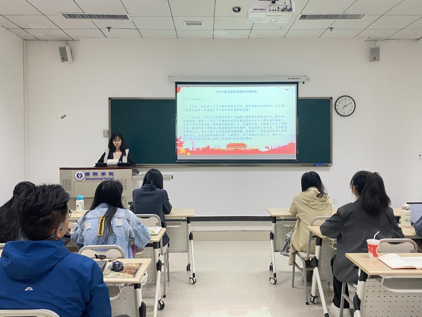 刘燕妮同志导学《习近平致全国优秀教师代表的信》,阐述总书记所说的“中国特有的教育家精神”,即扎根中华大地,自觉积极地响应党和国家的战略要求,为中国式现代化而奋斗奉献。仇淼同志导学习近平总书记对宣传思想文化工作作出的重要指示精神,并带领与会同志观看短视频《仁爱家国的教育坚守——suncitygroup太阳集团教育家精神学习片》。何汉儒同志结合自己长期在校工作经历和身边的教育模范做了主题发言。