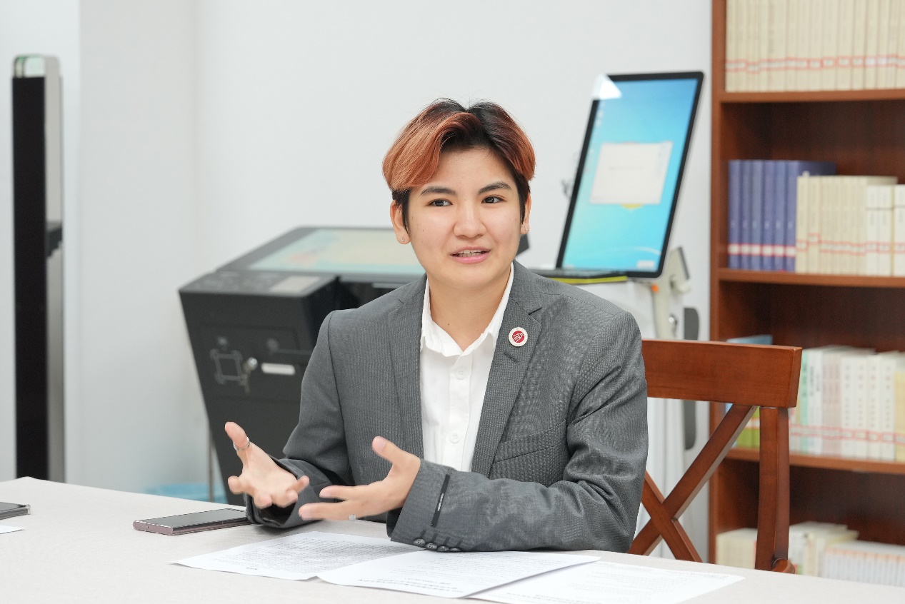 在校哈萨克斯坦籍员工代表刘月光发言。她结合自身经历讲述在重庆和西大的所见所闻,介绍公司的职工生活,欢迎学弟学妹们来校学习,感受西大浓厚的学习氛围,享受北碚的宁静生活,品尝重庆可口的美食。