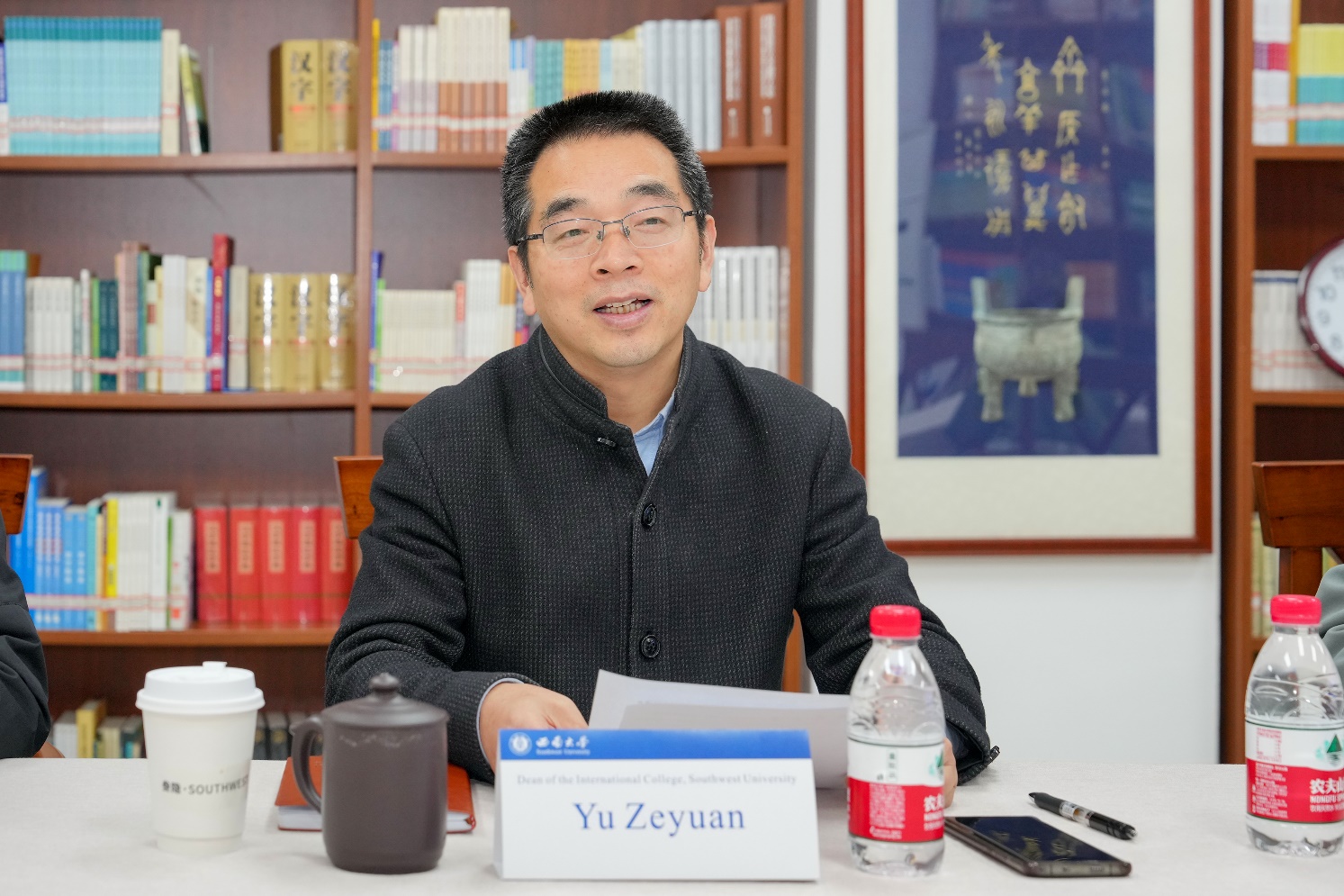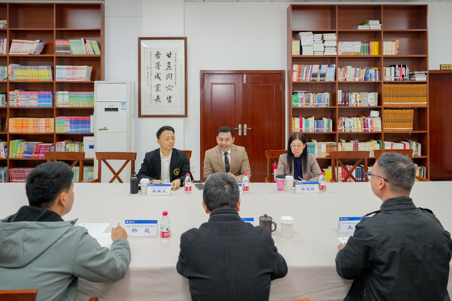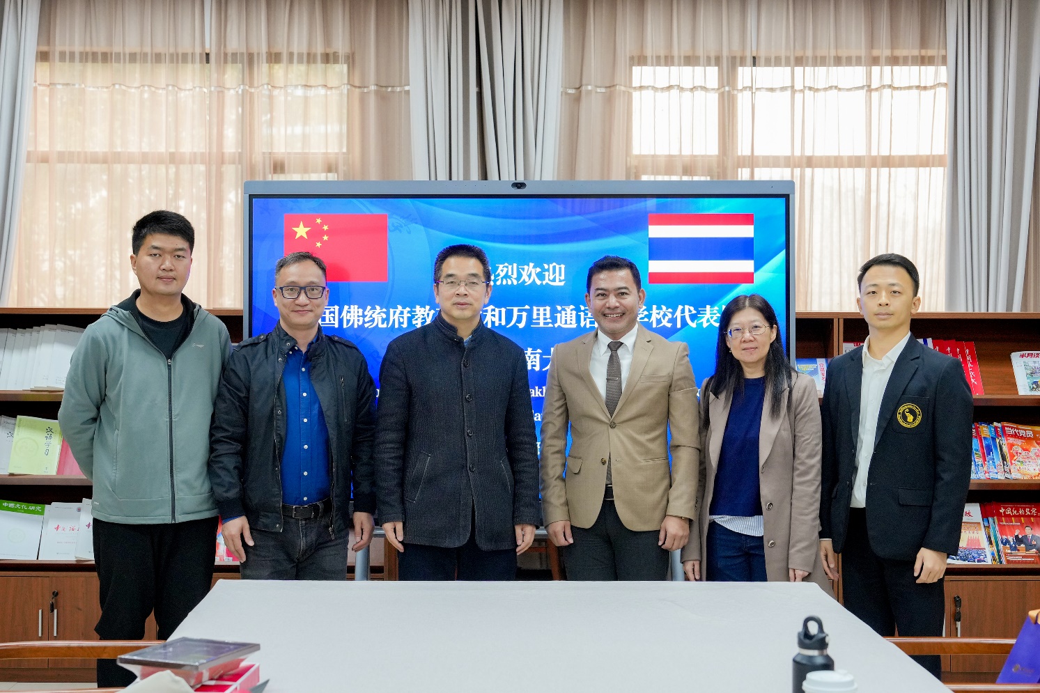 3月20日上午,泰国佛统府教育厅厅长空格潘·威卢萨洛先生(Kongkrapan Verusarod),泰国万里通语言公司泰方董事长徐思梅女士(Nongnuch Cheewasrirungruang)以及中方董事长吴振文先生一行访问公司。于泽元经理,员工工作办公室杨昆主任、外国员工招生办公室王鹊在公司图书馆参加座谈交流。