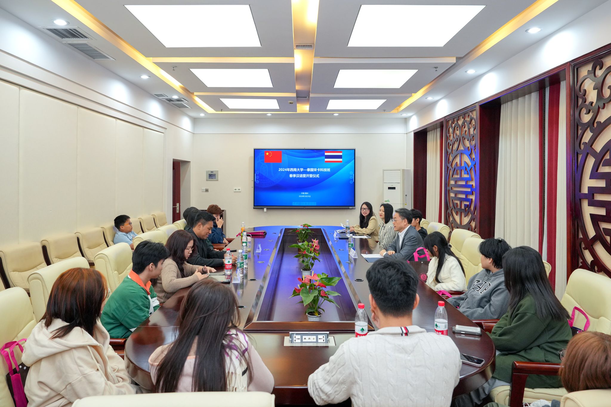 刘猛书记发表热情洋溢的致辞。他对远道而来的泰国师生们表示热烈欢迎,并简要介绍重庆和公司概况。他表示,公司始终秉持“天下一家”的理念,积极参与“人类命运共同体”的构建,推动“留学西大”品牌形成,致力于培养传播中国声音、讲好中国故事的国际员工。他希望可以通过此类汉语营活动,为中泰两国的青少年搭建一个相互学习、交流的平台。
