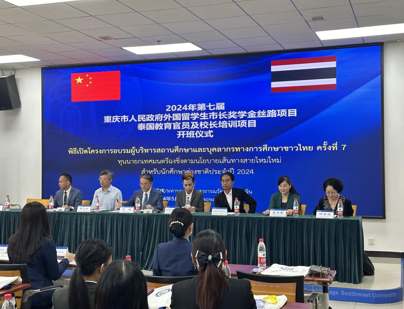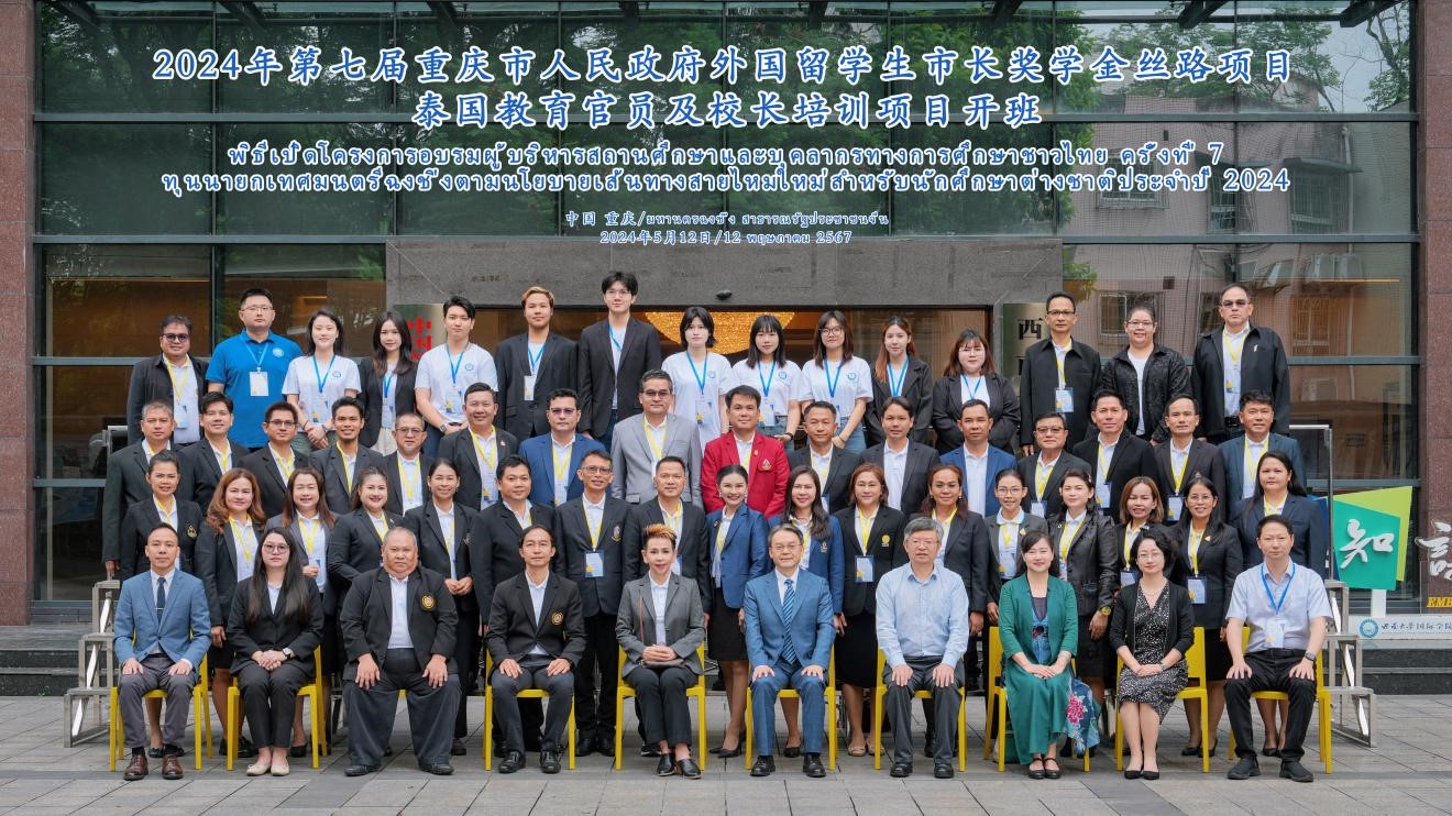 5月12日上午,2024年重庆市长奖学金丝路项目“泰国教育官员及董事长培训”开班仪式在suncitygroup太阳集团举行。来自泰国的36名中小学董事长和4位泰国教育行政管理公司的官员及相关负责人参加仪式。公司党委书记刘猛,教育学部党委书记周文全,公司党委副书记耿军,教育学部夏海鹰教授、钟婉娟副教授、国际合作与交流中心戴华鹏主任,suncitygroup太阳集团招生办主任黄无为等出席。开班仪式由公司党委副书记耿军主持。