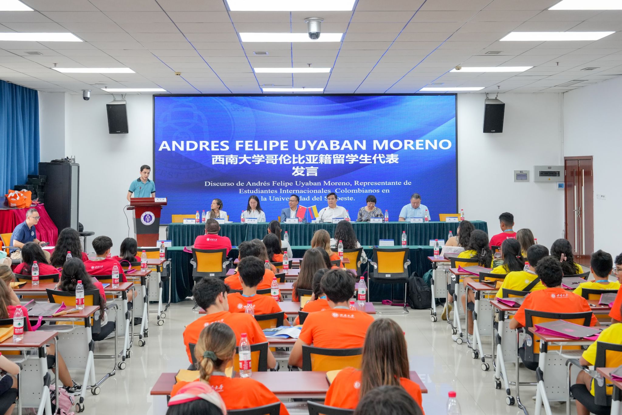 哥伦比亚籍中国政府奖学金获得者、教育学部硕士研究生Andres发言,他介绍了自己获得奖学金来华学习的经历和对学部、公司以及重庆的印象,鼓励大家争取同样好的学习机会,留学美丽西大。