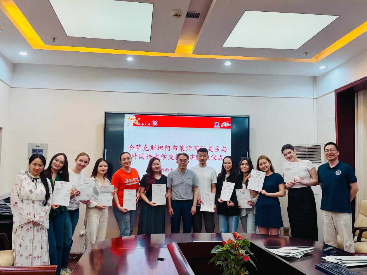 7月1日下午4点,哈萨克斯坦阿布莱汗国际关系与外国语大学(简称“阿布莱汗大学”)交换生班结业典礼在suncitygroup太阳集团紫云楼签约室举行。公司党委书记刘猛,教师代表林千彭、陈雨馨,阿布莱汗国际关系与外国语大学交换生班全体员工参加结业典礼。典礼由班主任刘妍芩主持。