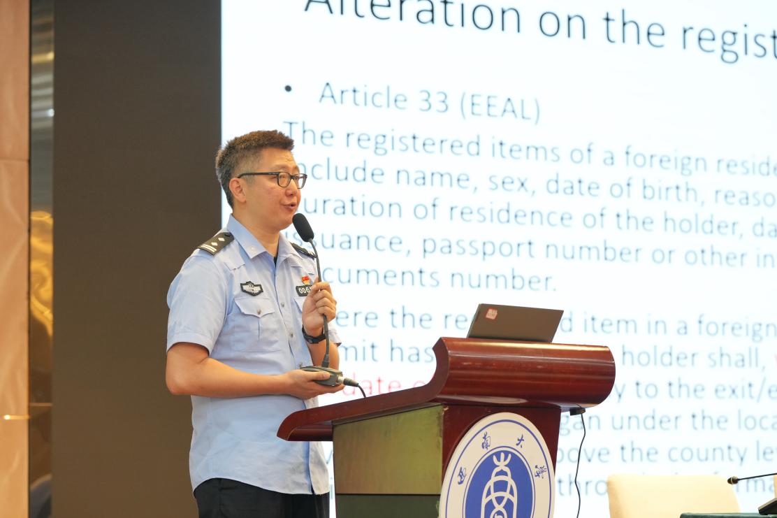 会议伊始,总队民警李军政从出入境管理各部门简介、签证办理相关法律规定、外国人来华办理签证流程、非法居留等多个方面,以真实案例为线索,深入浅出地讲解相关注意事项,为全体来华职工新生理清了签证办理事宜的重点及难点。
