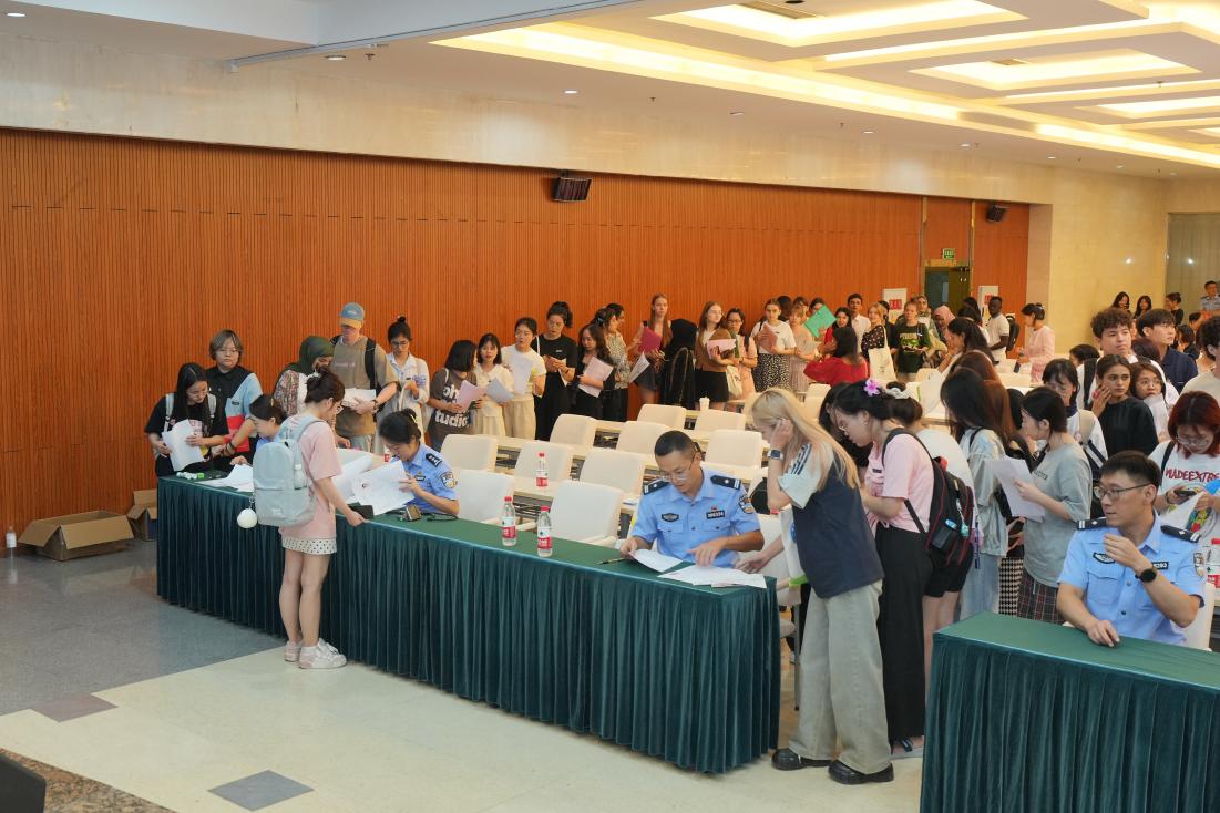 随后,警官们为全体新生提供现场签证面签服务,职工们有序排队提交签证材料,最大化地保障签证工作的高效完成。