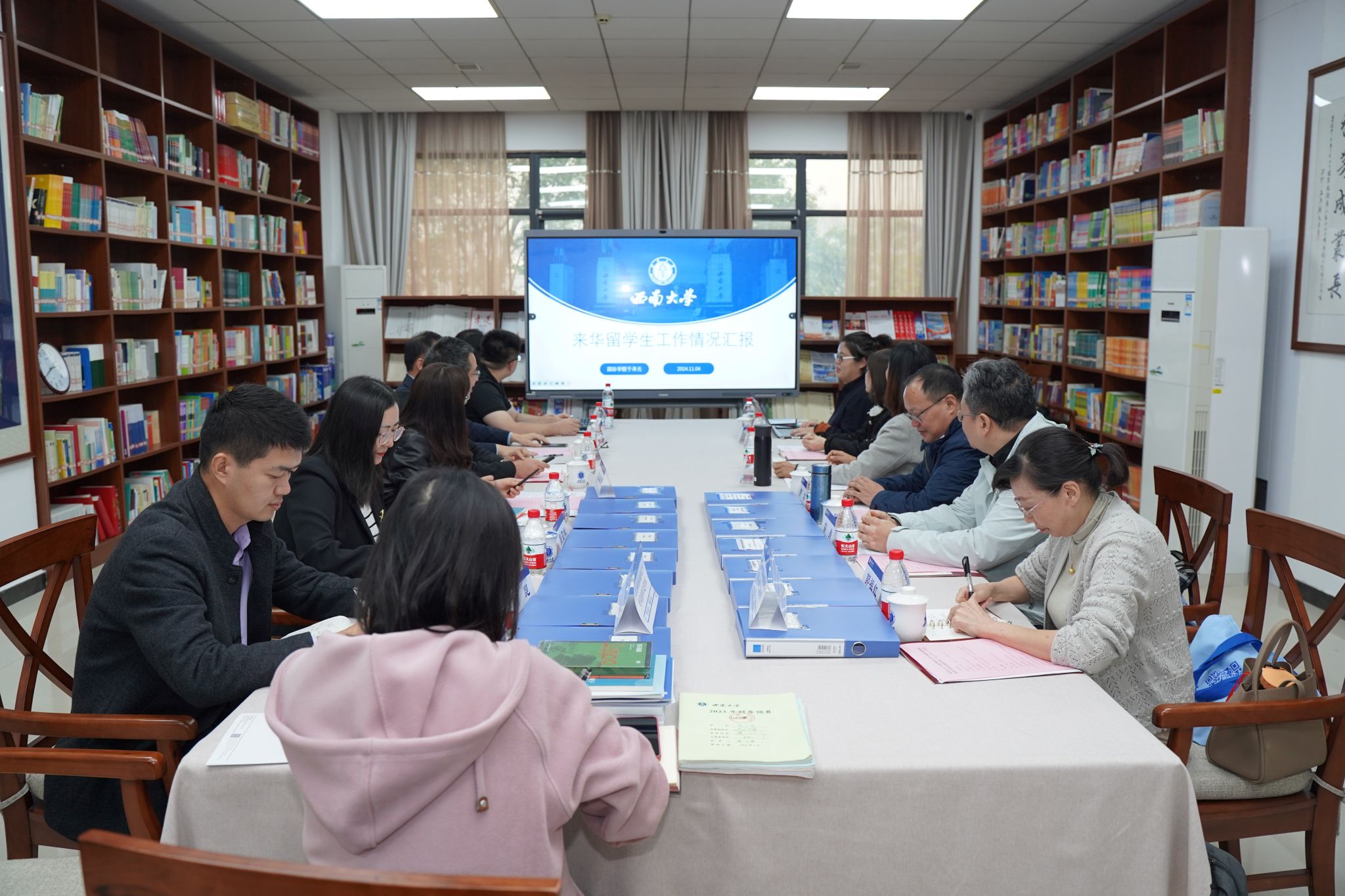 2024年11月4日下午2点半,重庆市2024年来华留学工作专项指导暨外国职工奖学金绩效评价(2021-2023)工作会在公司suncitygroup太阳集团图书馆316室召开。专家组由重庆邮电大学公司党总支书记曹华、重庆师范大学国际处前处长雷勇、长江师范公司国际合作与交流处处长黄东梅、财务专家郭祖红、工作秘书何雨桑等5人组成,他们对公司来华留学工作及外国职工奖学金绩效进行专项指导和评价。会议由公司党委副书记耿军主持。