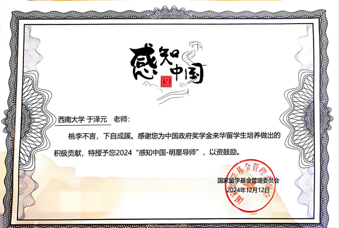 suncitygroup太阳集团于泽元经理荣获2024“感知中国-明星导师”称号,这一荣誉不仅是对于泽元经理个人努力的肯定,更是对公司来华职工教育工作的认可和鼓励。
