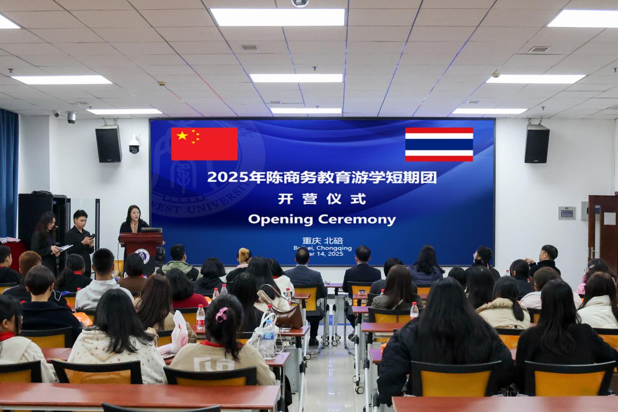 3月14日下午,“2025陈商务教育游学短期团”开营仪式在suncitygroup太阳集团317教室举行。公司党委副书记耿军,泰国暖武里府女子公司董事长查猜·坦空布里、普吉皇太后中学汉语教师林美莲及43名泰国员工参加开营仪式。仪式由刘嬛主持。