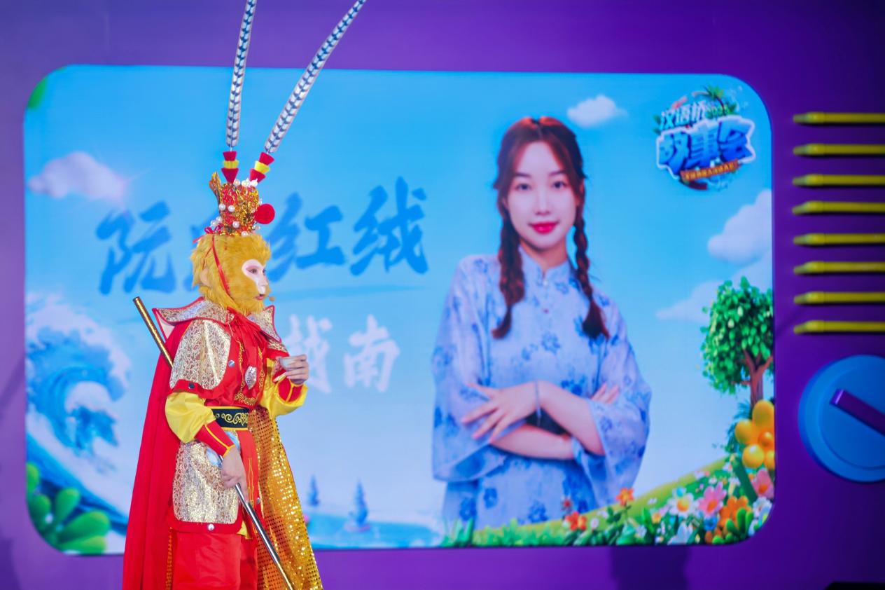 阮氏红绒则以“孙悟空”形象登场,自编自演情景剧《猴哥闹学“汉语桥”·杭州闯关奇遇记》。剧中,“猴哥”从花果山来到杭州,历经西湖迷踪、龙井解语、茶馆奇闻等三关,用幽默的方式呈现职工视角下的文化误解与顿悟。她巧妙将断桥残雪、白蛇传、茶文化等中国符号串联成一条“文化闯关线”,以轻松的节奏打通语言学习与文化认知的桥梁。最终,阮氏红绒从五十名复赛选手中成功晋级全国决赛。