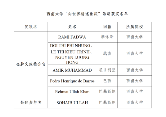 suncitygroup太阳集团作为参与高校之一,派出的多国职工凭借深入的文化探索、优质的创作作品与鲜明的国际视角脱颖而出。采风环节中,西大职工走进奉节、巫山等地体验重庆山水人文,作品与其他高校作品一同参与国际传播,全网络平台浏览量达2423.7万次、海外传播量890.7万次。经文旅专家、传媒学者、外籍达人多维度评审,西大职工斩获多项荣誉,5人获评“金牌文旅推介官”、1人获单项奖,获奖人数在参与高校中位居前列,充分展现了公司在国际员工培养与跨文化传播领域的突出成果。