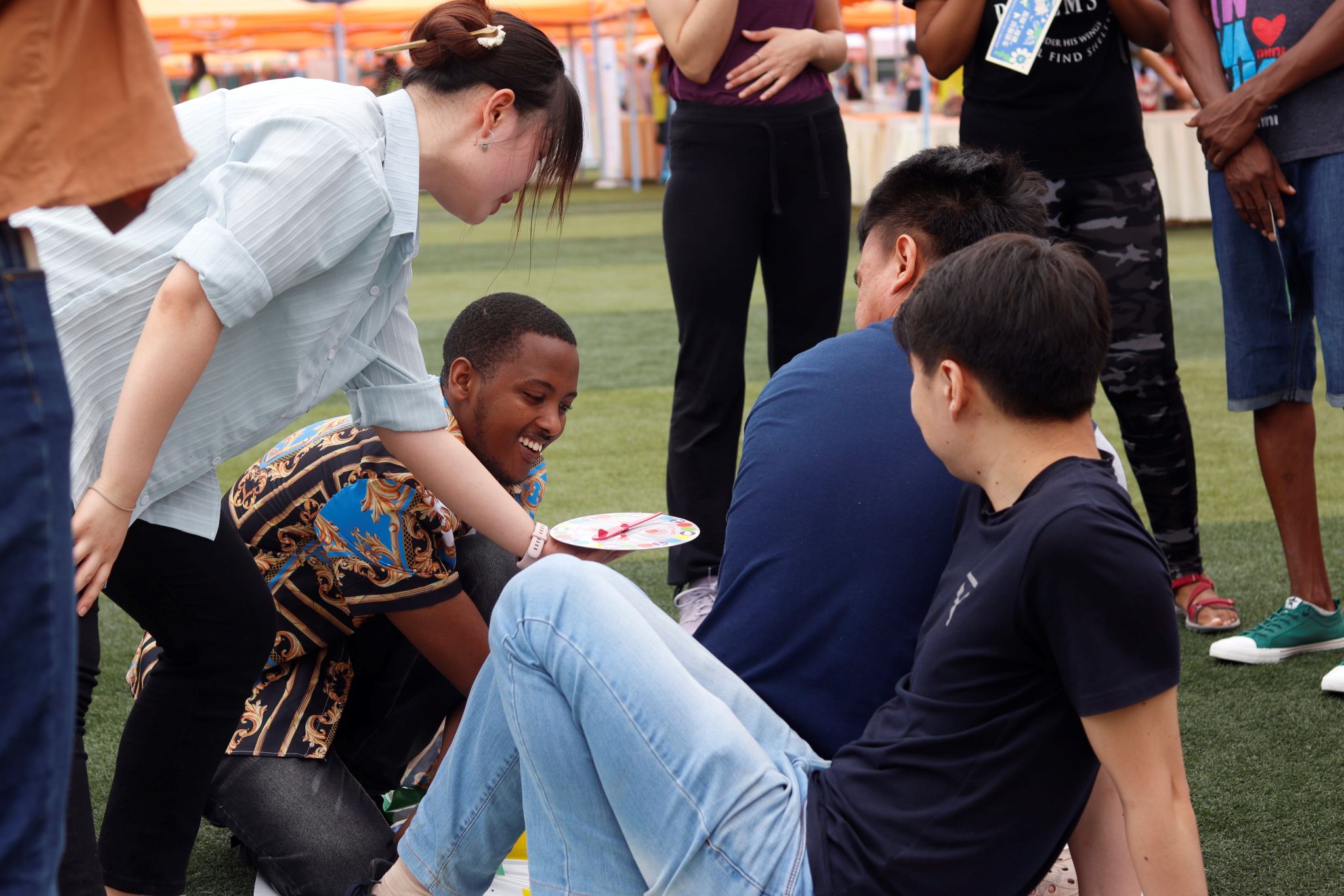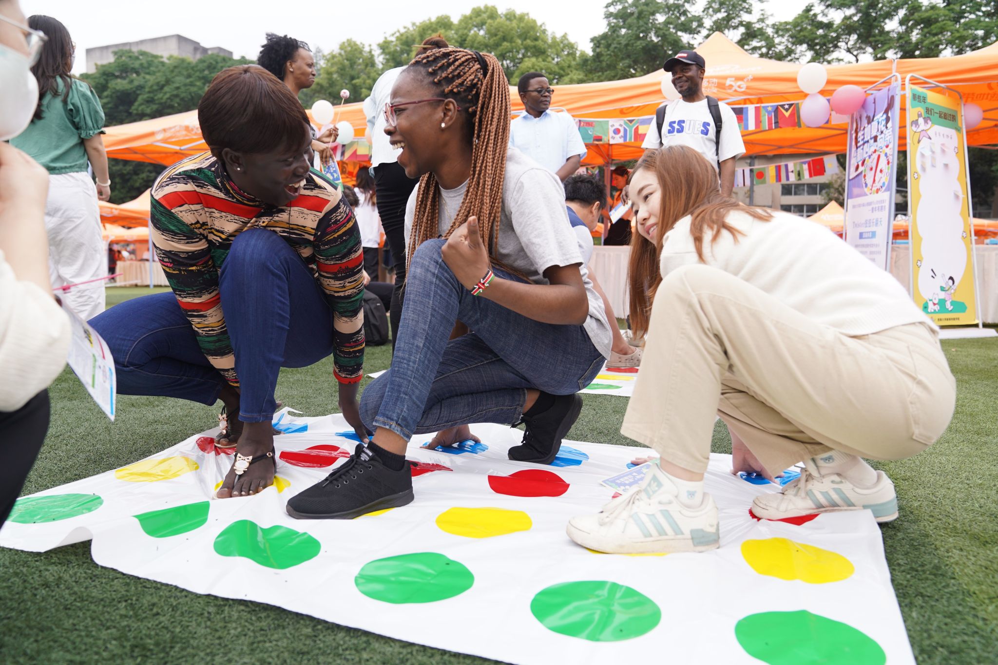 “Twister扭扭乐翻天”,顾名思义就是要让大家扭成一团。转盘会指出需要用哪只手或者哪只脚,压在地毯的哪种颜色上,平衡感好的人容易坚持到最后。地毯上的同学逐渐扭出各式各样的姿势,逗得旁边的同学哈哈大笑。