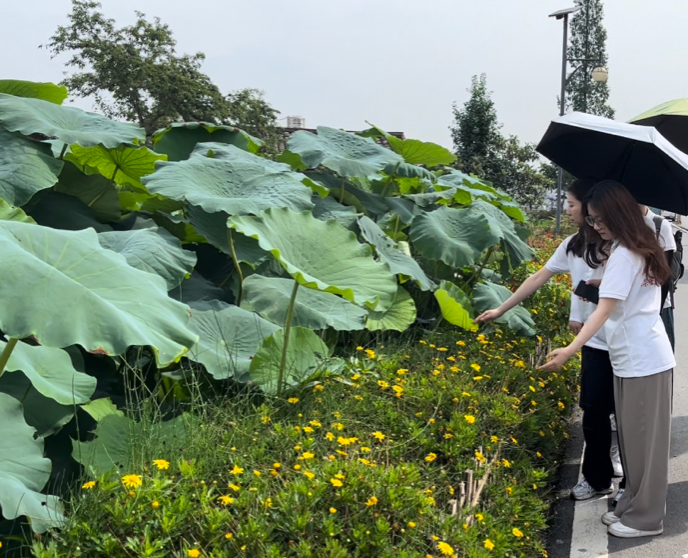 村委会旁的荷塘里,荷叶翠绿连天、荷花亭亭玉立,谁会知道这片碧绿荷塘竟是由生活污水净化而成。经工作人员解释,实践队了解到此荷塘采用的是“厌氧+人工湿地+氧化塘”处理模式,不仅以低成本实现高效益,解决了当地生活污水直排问题,还提升了村庄“颜值”,改善了农村人居环境,实现经济和社会效益的双赢。