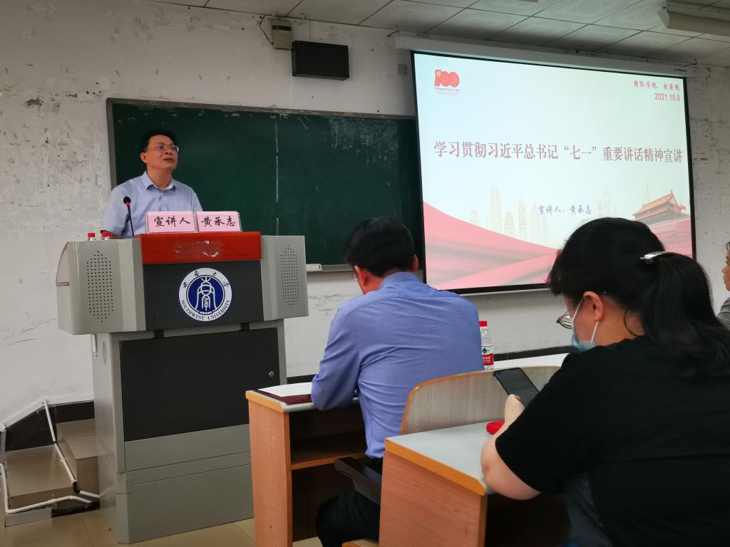 2021年10月8日,根据公司安排,suncitygroup太阳集团组织全体教职工开展第九次政治理论学习,黄承志副部长做习近平总书记“七一”重要讲话精神宣讲,会议由刘猛书记主持。