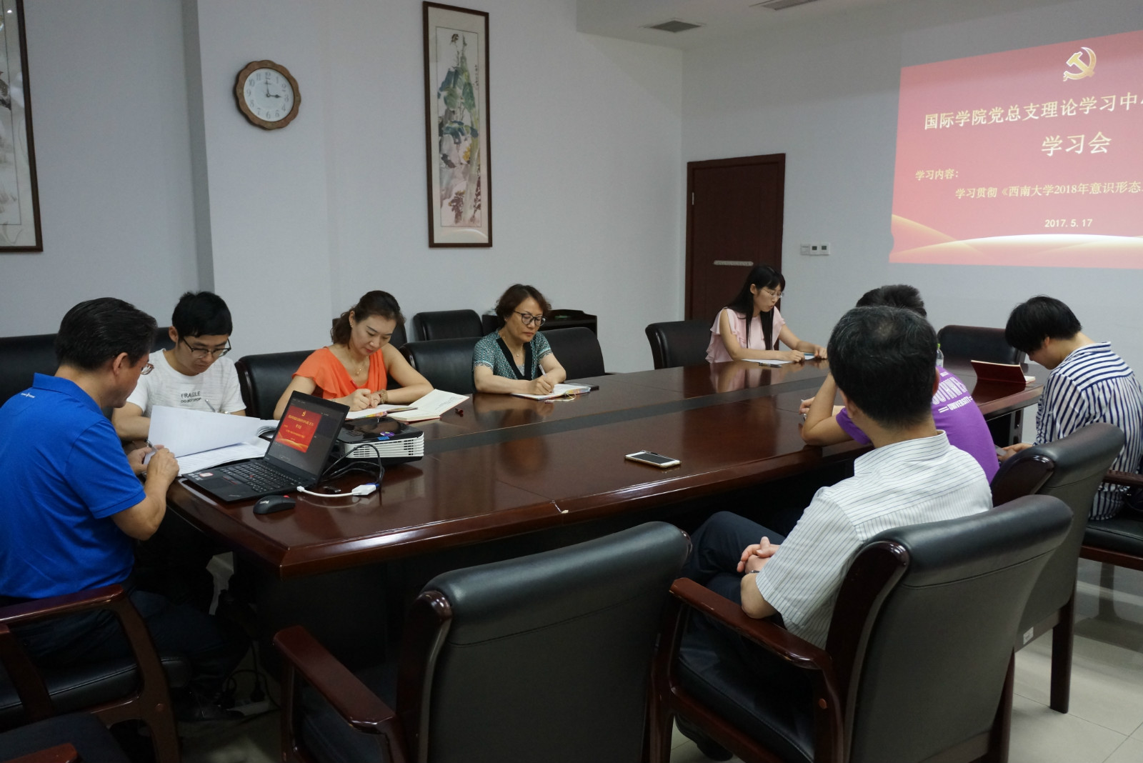 2018517日下午3:00,公司党总支在紫云楼304会议室召开理论学习中心组(扩大)会议,党总支委员,不是党总支委员的院领导,支部书记、院办主任、汉教系主任参加会议,会议由刘猛书记主持。