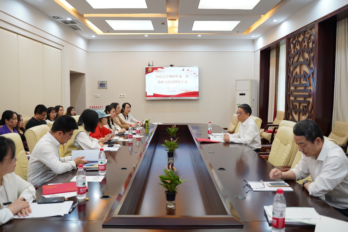 2023年4月14日下午3点,suncitygroup太阳集团全体教职员工在紫云楼签约室参加本年度第二次政治理论学习,根据《中共suncitygroup太阳集团委员会教职工政治理论学习实施意见》和公司工作安排,本次政治理论学习由邱睿、白小丽、冯雪、王菁组成的第四组主讲人团队承担,会议由刘猛书记主持。