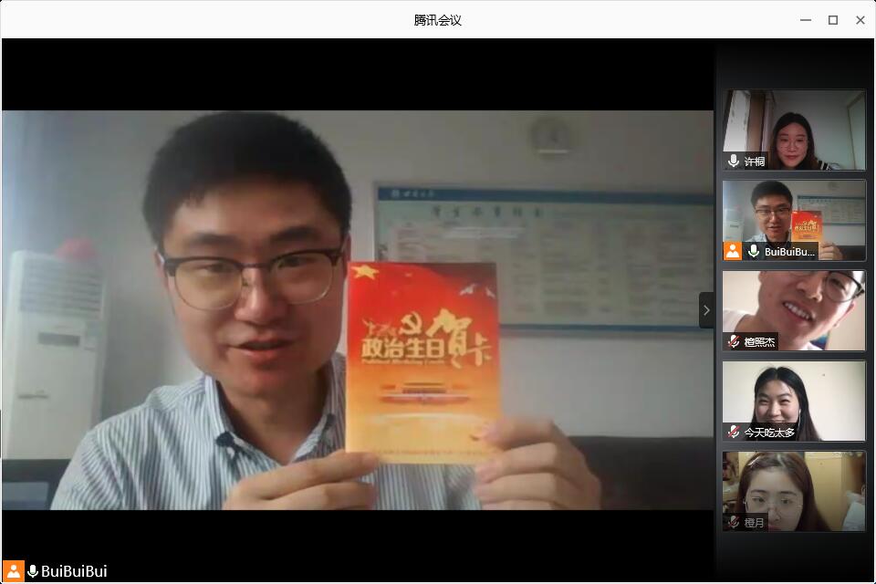 全体支部成员通过网络会议,重温入党誓词。支部全体成员为六月入党的祝倩、檀照杰、许桐三位同志过政治生日,置身于这样充满仪式感的氛围中,发表生日感言,他们皆表示:“初心不改、砥砺前行,不负韶华、永不懈怠,为实现中华民族伟大复兴而奋力拼搏。”