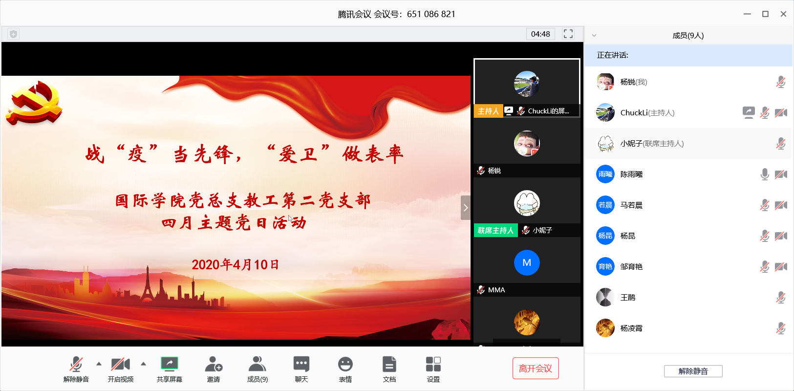 410日下午,教工二支部在线举行了“战‘疫’当先锋 ‘爱卫’做表率”的主题党日活动。刘燕妮同志首先带领全体党员导学了《国家记忆》之《爱国卫生运动六十五年》专题纪录片的有关内容。邹育艳和马若晨同志分别进行了交流发言。 他们表示当今世界正在面临百年未遇之大变局,疫情对于我们既是挑战,又是机遇。我们经受住了挑战,同时向世界展示了强大的组织协调能力、国力、凝聚力。随后,李林泽同志对《习近平给北京大学援鄂医疗队全体90后党员的回信》和《动员广大群众积极参与爱国卫生运动的倡议书》的有关内容进行了导学,杨凌霄和何汉儒同志分别就北碚地方医院参与援鄂情况和suncitygroup太阳集团前台保安人员在抗疫中的先进事迹分享了自己的心得体会。最后,支部为4月份入党的何汉儒和邹育艳两名同志过了政治生日。