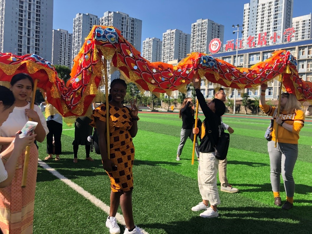 随后,两江名居小学的师生在运动场向suncitygroup太阳集团的师生们展示了公司颇具特色的“父子龙”舞龙表演。表演中,老师们挥舞着“父龙”,员工们挥舞着“子龙”,每一个动作都让观看者拍手叫绝。在体验舞龙魅力的过程中,刚果布职工思拉河还即兴为大家表演了一段精彩的中国武术,场面热闹非凡。