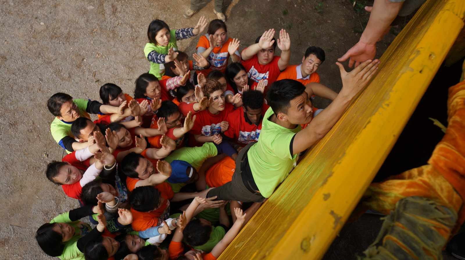 最后是惊险的“逃生墙”项目,这个项目中三个互相竞争的小团队,又融合成了原本的大团队,共同应对在紧急情况下,徒手翻跃4米多的高墙,完成集体逃生。项目在大家的共同努力下有序进行,不巧的是遭遇两次挫折(也许正是教练有意设置的训练障碍)。好在团队中踊跃站出了一批甘当人梯队员,自愿最后逃生队员,愿意承担责任的队员,三十多名队员的高墙“逃生”,仅仅用了19分18秒,成绩实在令人震撼。事后教练让活动中敢担当、能奉献的队员发表感言,由此及彼,沥血真言,不禁让人泪眼汪汪。