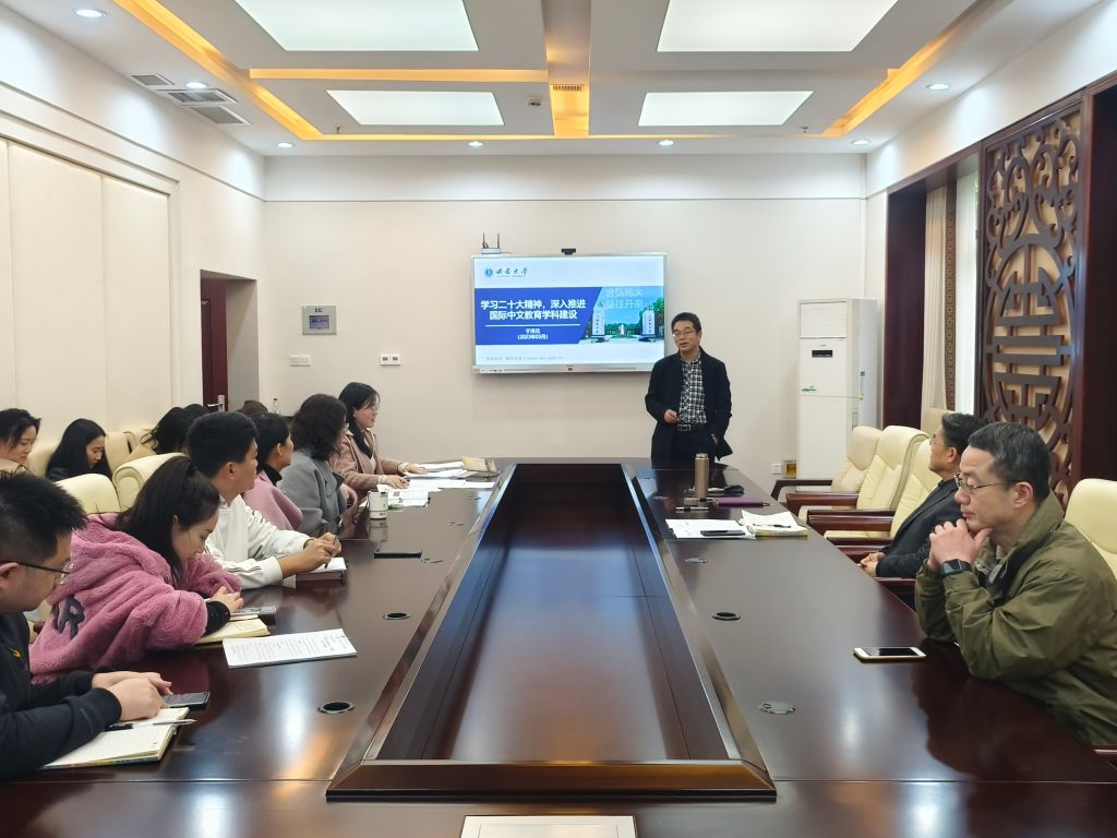 3月17日下午15时,公司党委在紫云楼签约室召开理论学习中心组(扩大)学习会议,于泽元经理作《学习二十大精神,深入推进国际中文教育团队建设》主题报告。会议由刘猛书记主持,公司党委委员、支部书记、各科室主任和教职工参加学习会。