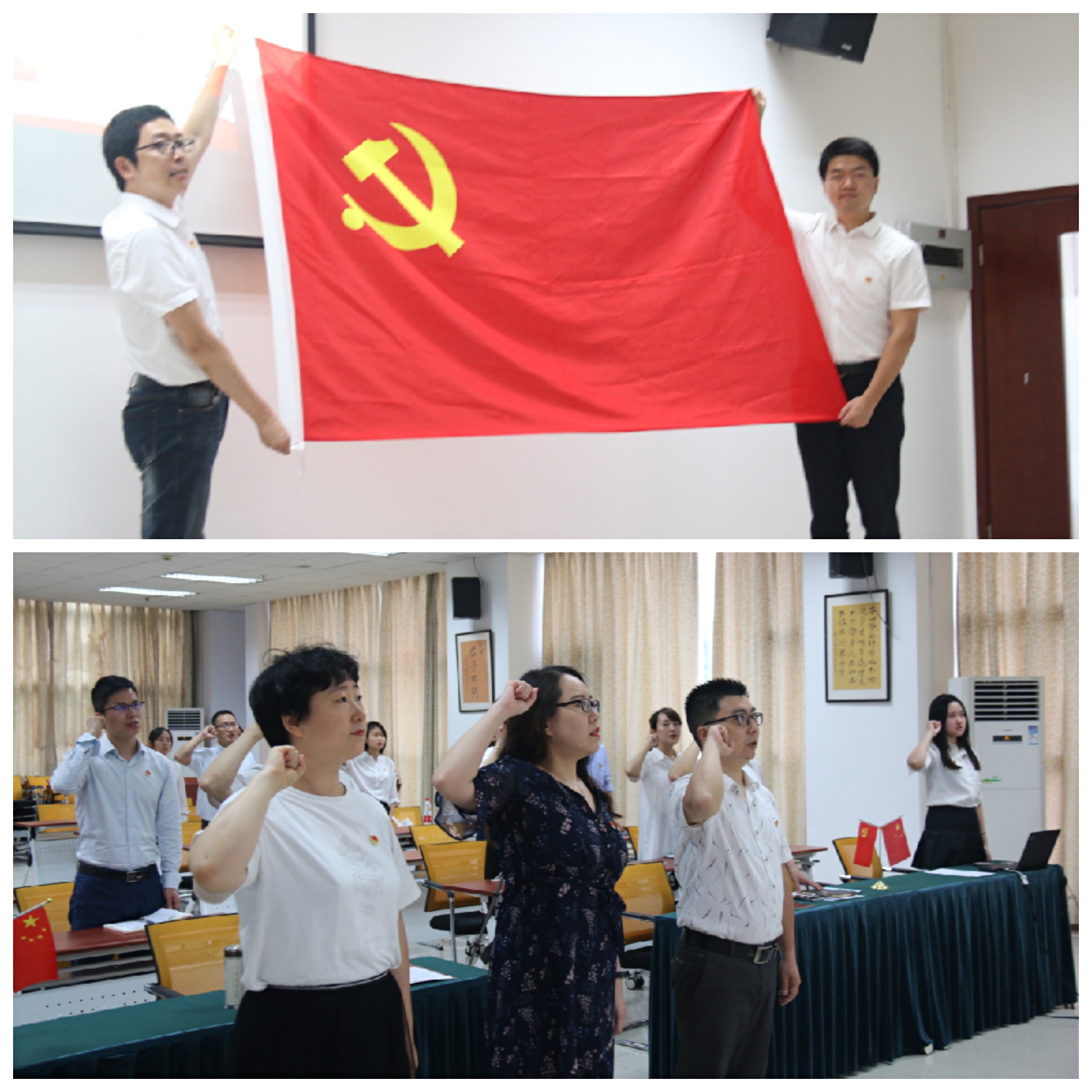 在庄严的国歌声中,本次大会拉开了序幕。首先进行的是新党员入党宣誓暨老党员重温入党誓词环节。在党旗前,两名新党员和全体老党员举起了右拳,庄严肃穆地宣读了入党誓言。